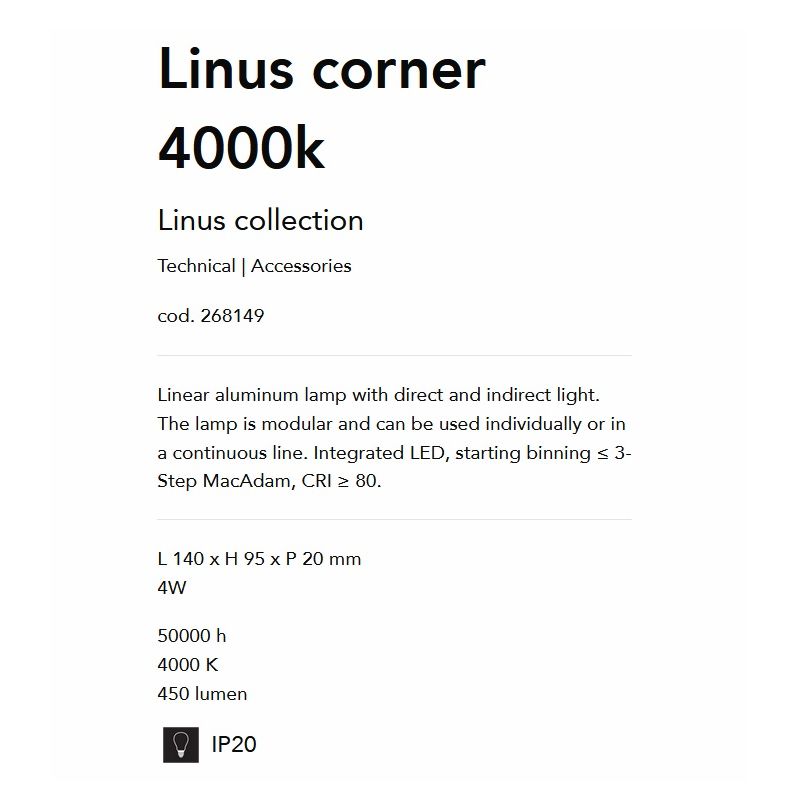| Informatii produs: | conector colt pentru conectarea modulara a lustrelor liniare LINUS albe 4000K |