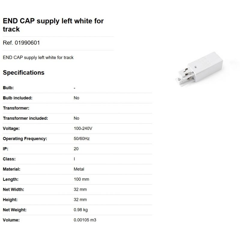 Accesoriu, Capat stanga alb, electrificat pentru sina Faro 3 PHASE TRACK