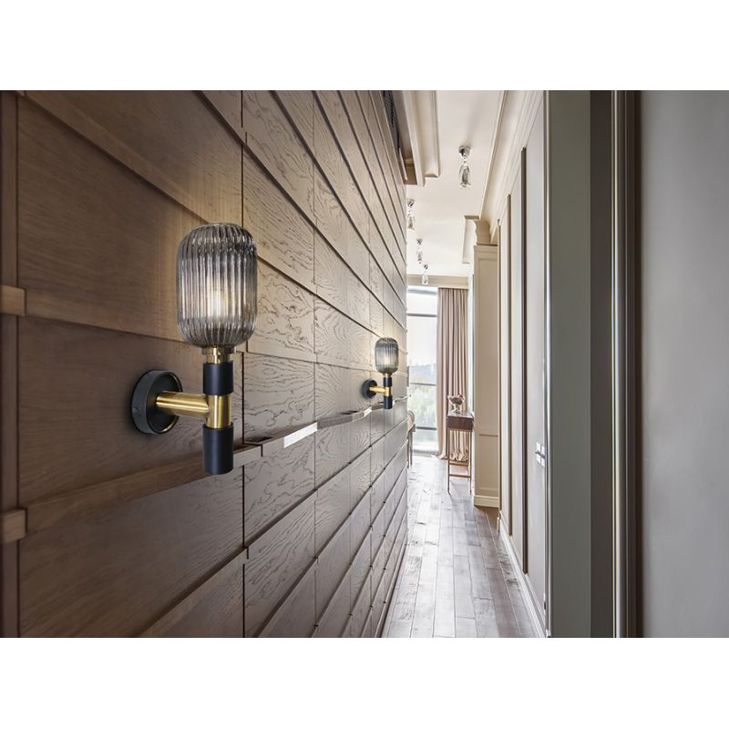 | Materiale | metal finisaj negru mat cu detalii alama satinata, abajur sticla decorativa finisaj gri fumuriu |