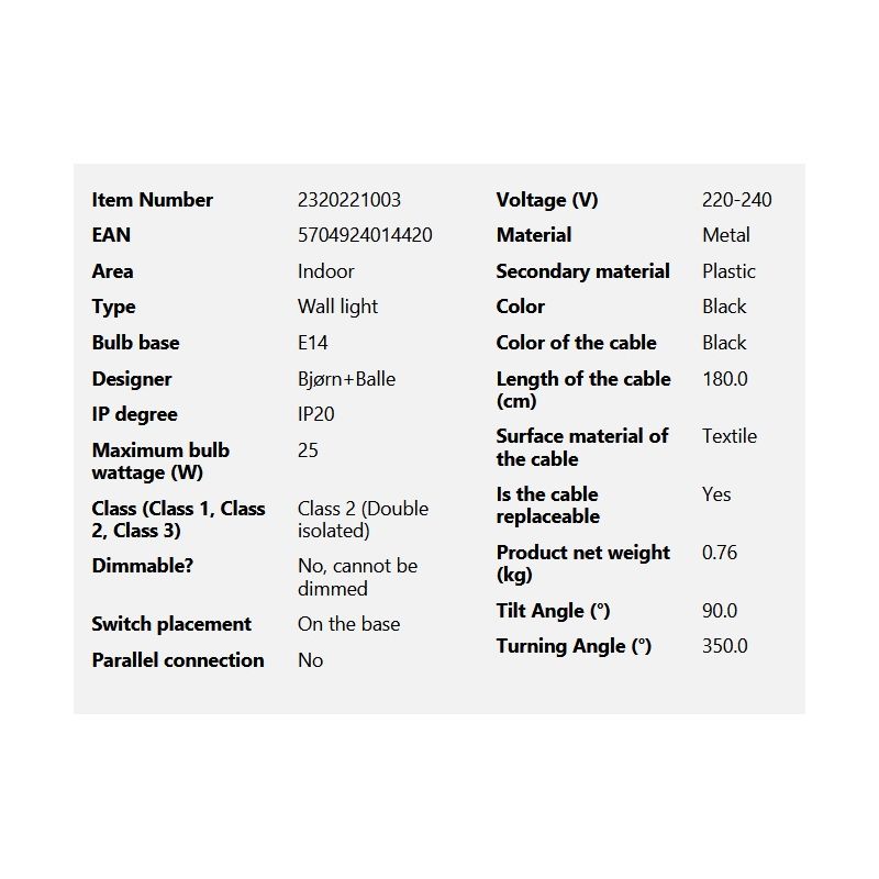 Informatii produs: | aplica vine pre-cablata cu un cablu de 150cm, cu stecher, care poate fi îndepartat permitând să conectați aplica direct la rețea. |
