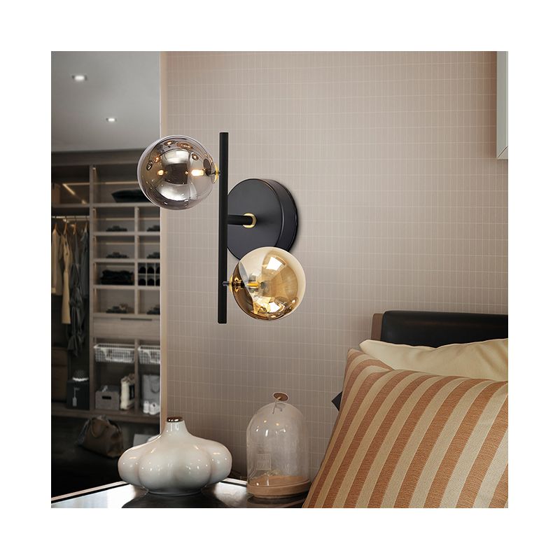 | Descriere | metal finisaj negru mat cu detalii alama satinata, abajur sticla sferica decorativa in finisaj fumuriu lucios si chihlimbar |