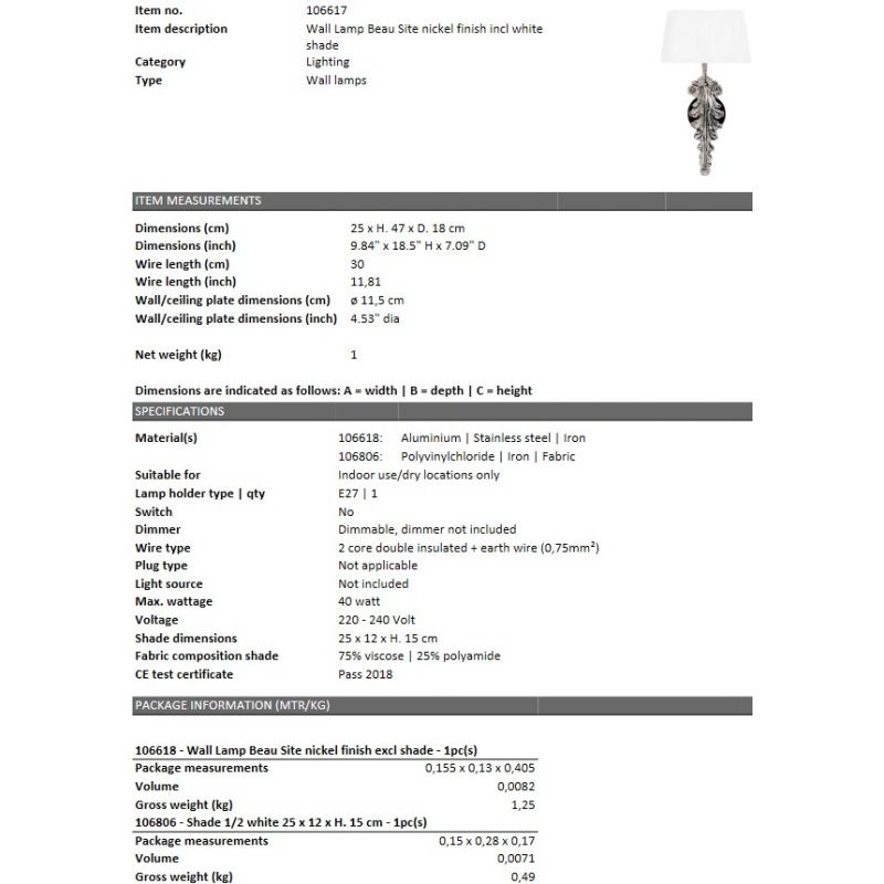 | Materiale | metal finisaj nickel, abajur tesatura alba |