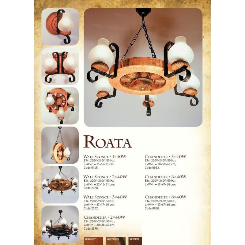 | Descriere | lemn de fag, fier forjat patinat si abajururi mate tip opait |