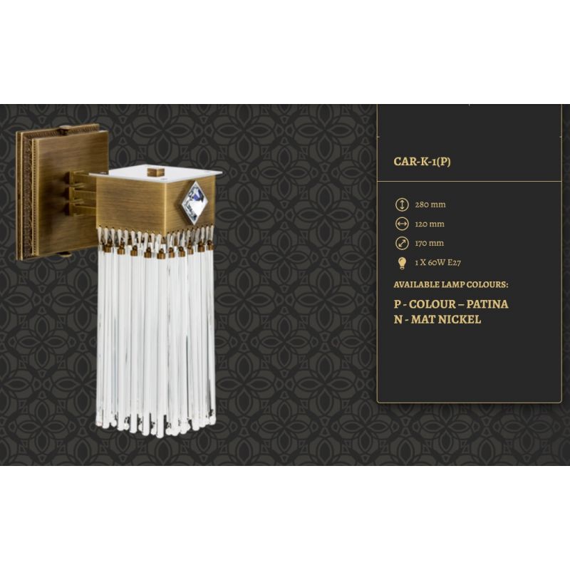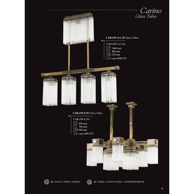 Seria Carino se distinge activ de alte lustre cu design clasic. Tuburile din sticlă care curg în jos sunt montate pe suporturi speciale realizate și prelucrate manual. Aceasta este o soluție neobișnuit de elegantă și rar folosită, care dă un efect de iluminare uimitor în orice interior. Bijuteriile din cristal decorează elegant candelabre, lămpile de podea și aplicele din seria Carino.