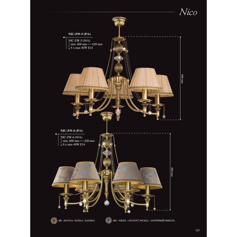 Seria Nico este o colecție rafinată de candelabre clasice, aplice și lustre elegante. Bazele originale ale lămpilor, o varietate de abajururi și cristale subliniază excelența formelor și a detaliilor. O gamă largă de culori și structura materialului în sine vă vor ajuta în alegerea abajurului pentru corpurile din colecția Nico. Puteți alege un abajur din sticla sau unul textil din material neted sau ondulat, simplu sau cu modele, precum și organza.