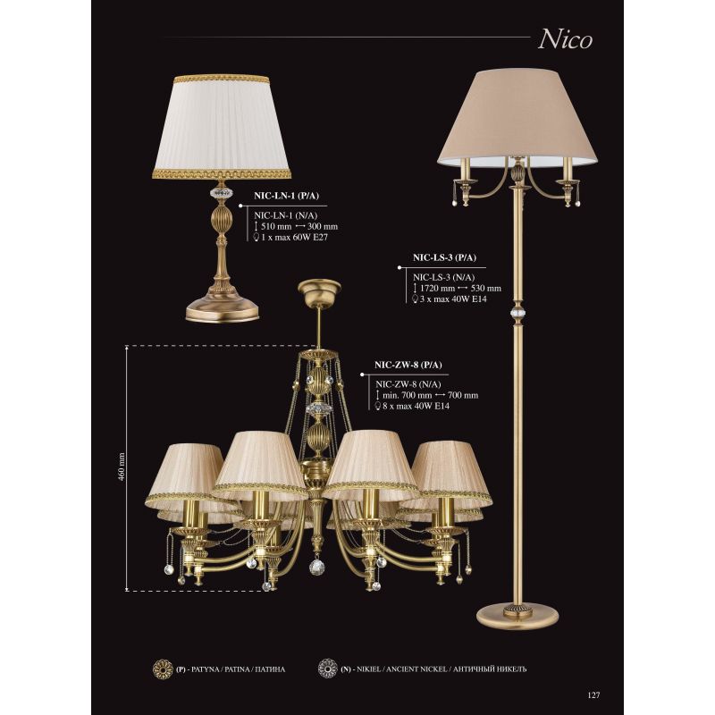 Seria Nico este o colecție rafinată de candelabre clasice, aplice și lustre elegante. Bazele originale ale lămpilor, o varietate de abajururi și cristale subliniază excelența formelor și a detaliilor. O gamă largă de culori și structura materialului în sine vă vor ajuta în alegerea abajurului pentru corpurile din colecția Nico. Puteți alege un abajur din sticla sau unul textil din material neted sau ondulat, simplu sau cu modele, precum și organza.