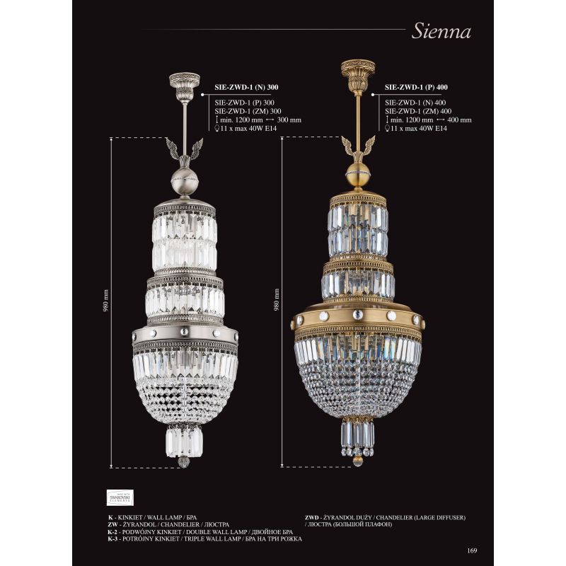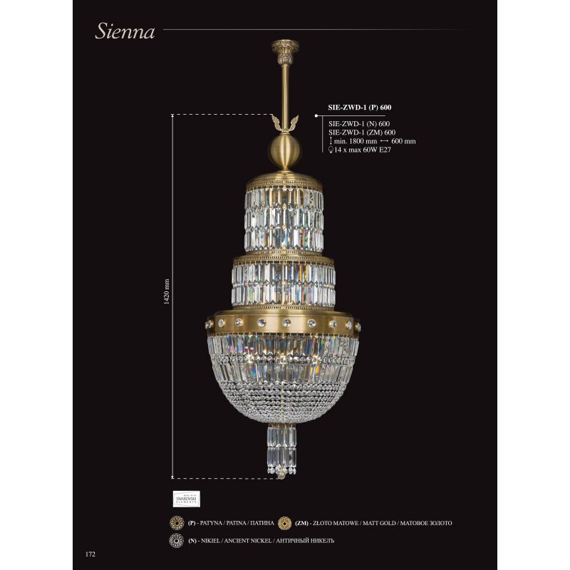 Luxul regal al lămpilor din colecția Sienna nu vor lăsa pe nimeni indiferent. Fiecare lustra este realizată manual, fiecare detaliu este gândit, cu dragoste și măiestrie. Bazele puternice și frumoase din alamă, nuanțele elegante de sticlă italiană, cu elemente decorative de lux spumante, realizate din cristale, vor deveni decorația regală a oricărui interior, fie că este vorba de un restaurant, hotel, casă de țară sau apartament. Alegerea unor astfel de lămpi accentuează gustul estetic al proprietarilor de case și, de regulă, vorbește despre respectabilitatea și prestigiul lor.
