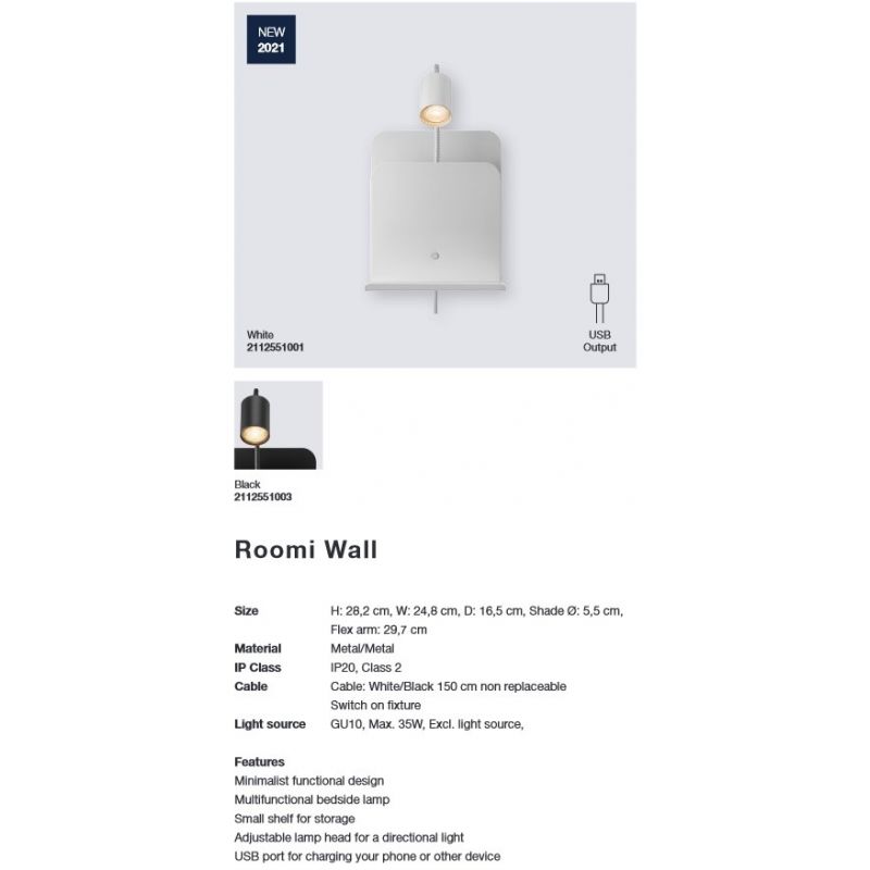 Aplica de perete Roomi este atât o lumină funcțională, un compartiment pentru magazii, cât și un raft practic care poate stoca cele mai importante necesități. Capul lămpii este ușor de reglat pentru o lumină direcțională și puteți încărca telefonul smartphone sau alt dispozitiv cu portul USB încorporat plasat sub raft. Ideala lângă pat sau în holul de la intrare pentru a vă urmări telefonul și cheile.