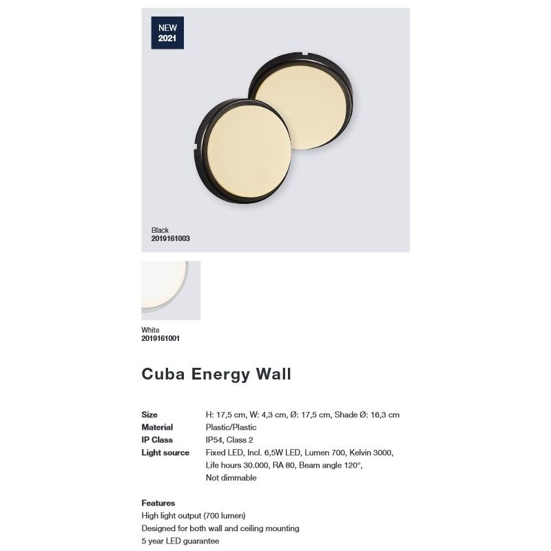 Cuba este proiectat cu un modul LED fix, care permite un design subțire și minimalist și o funcționalitate ridicată ideală pentru amplasarea atât pe tavan, cât și pe perete. Lampa ovală emite o lumină frumoasă și funcțională și are chiar și un grad ridicat de protecție, IP54, ceea ce o face ideală pentru utilizare în exterior. Deoarece Cuba este potrivită pentru zonele umede, poate fi montată în continuare în baie sau la subsol. Cuba Bright a primit numele pe baza puterii sale mari de lumen, care crește puterea de lumină a lămpii, menținând în același timp o lumină moale și caldă.
