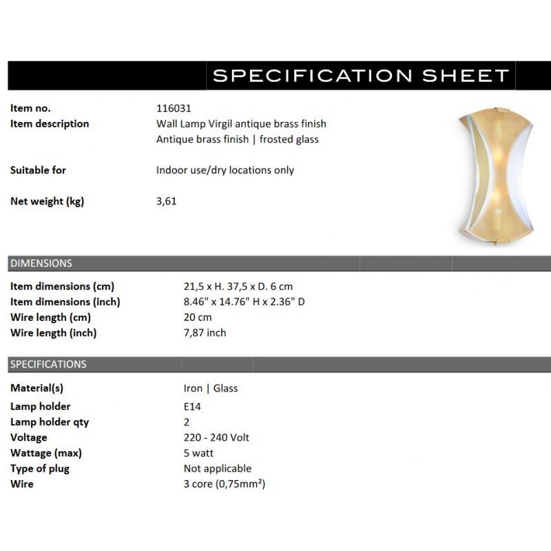 | Materiale | baza din otel finisaj alamă antic, sticlă mată cu aspect de gheata, părți laterale din sticlă transparentă |