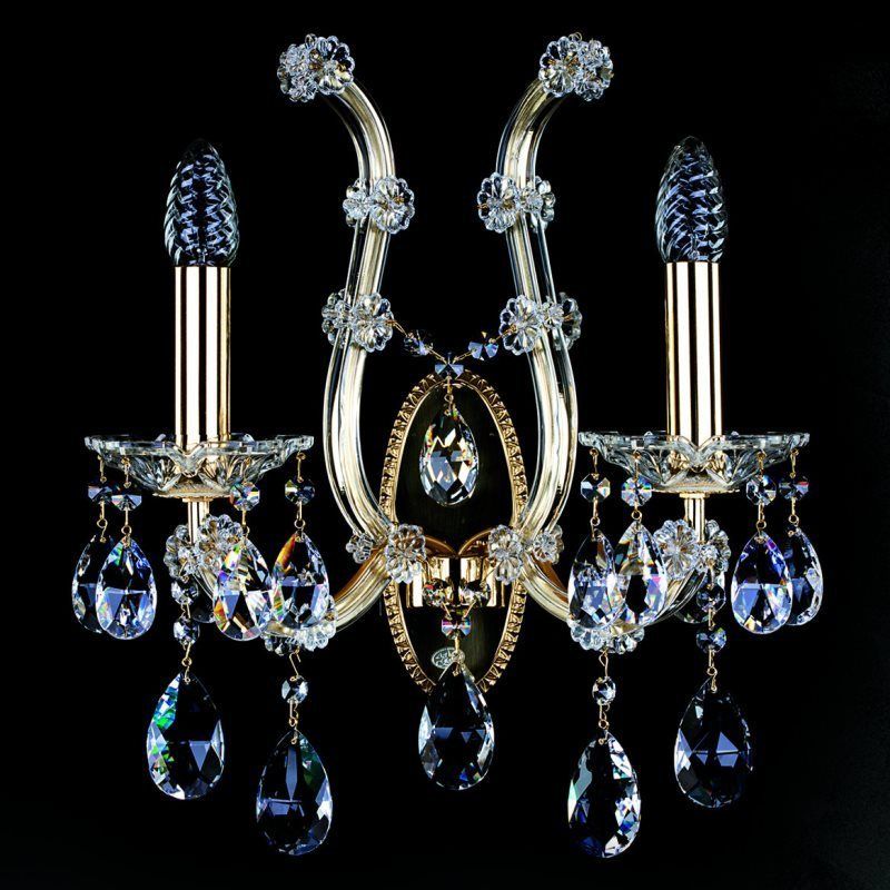 Aplica de cristal este decorată cu cristal Crystal Exclusive. Componentele din cristal și sticlă și piesele metalice fine în finisaj auriu, argintiu sau alte suprafețe fac o combinație uimitoare. Lumina lustrei de cristal, combinată în special cu alte candelabre de cristal, este potrivită pentru orice interior, modern sau tradițional.