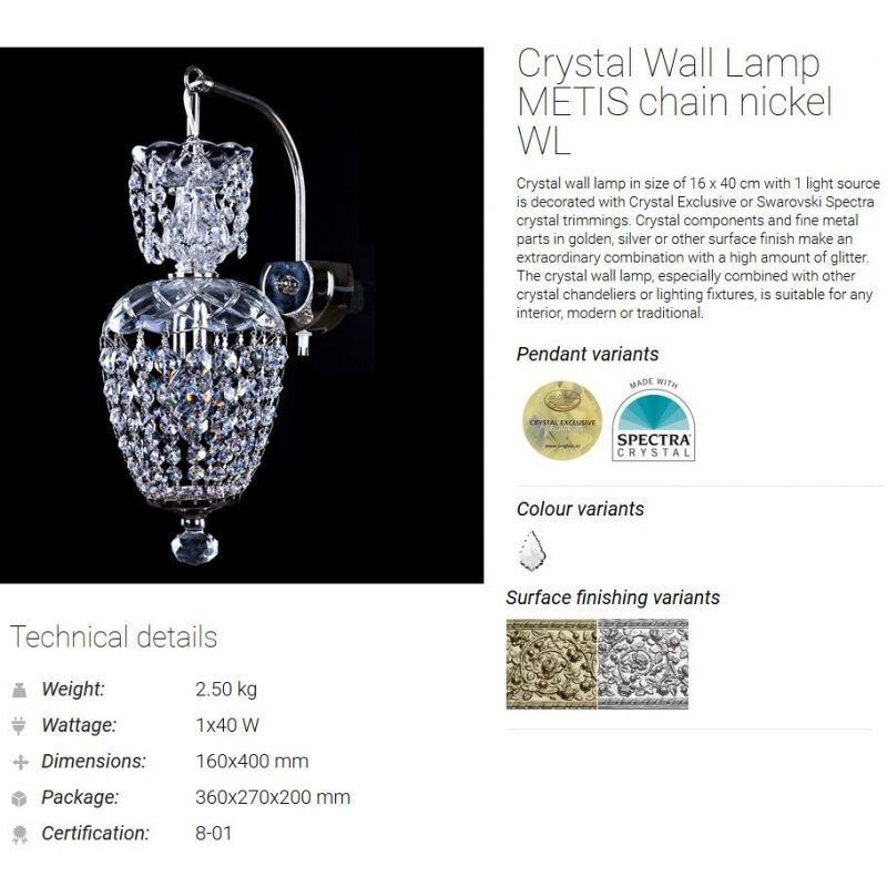 Cristalul utilizat are un conținut de până la 30% PbO, specific cristalului Bohemia, permițând realizarea unor forme variate de pandantive, inclusiv variante transparente sau colorate, în funcție de colecție. Structura metalică a corpurilor de iluminat este disponibilă, în funcție de model, în finisaje precum alamă auriu sau galvanizat argintiu.