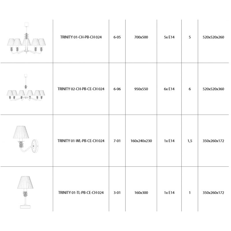 Aceste lămpi de colecție aparțin unui stil modern, arată excelent într-o casă sau apartament privat sau într-un design modern de hotel sau restaurant. Aceste lustre elegante din alamă sunt decorate cu cristale Exclusive care măresc splendoarea lămpilor și vă oferă o frumusețe unică. Colecția TRINITY include candelabre, aplice și lămpi de masă, cu abajure în minunate țesături, în special gama Organza, pe care o puteți alege din catalogul producătorului.
