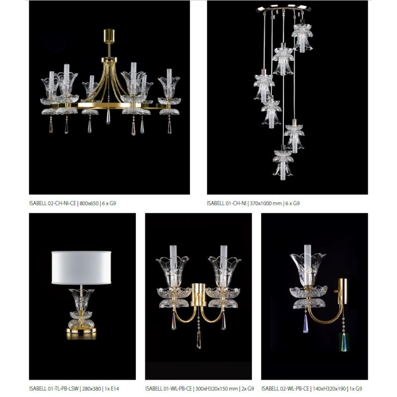 Isabell este o colecție jucaușă de corpuri de iluminat care, datorită designului lor unic, poate fi un plus de lux atât interiorului clasic, cât și modern. Aceste lustre elegante din alamă sunt decorate cu cristale Exclusive care măresc splendoarea lămpilor și vă oferă o frumusețe unică. Colecția Isabell include candelabre, aplice și lămpi de masă, cu abajure din sticlă în minunate forme așezate interesant pe o structură simplă din metal.