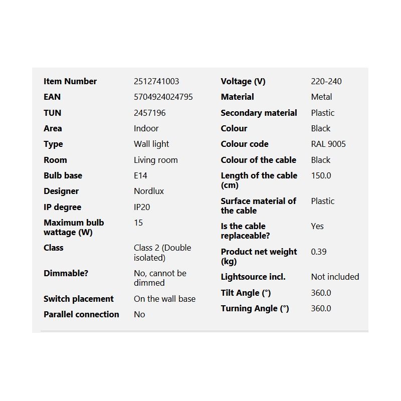 Informatii produs: | aplica vine pre-cablata cu un cablu de 150cm, acesta poate fi eliminat, permițând ca lampa să fie conectată direct la rețea |