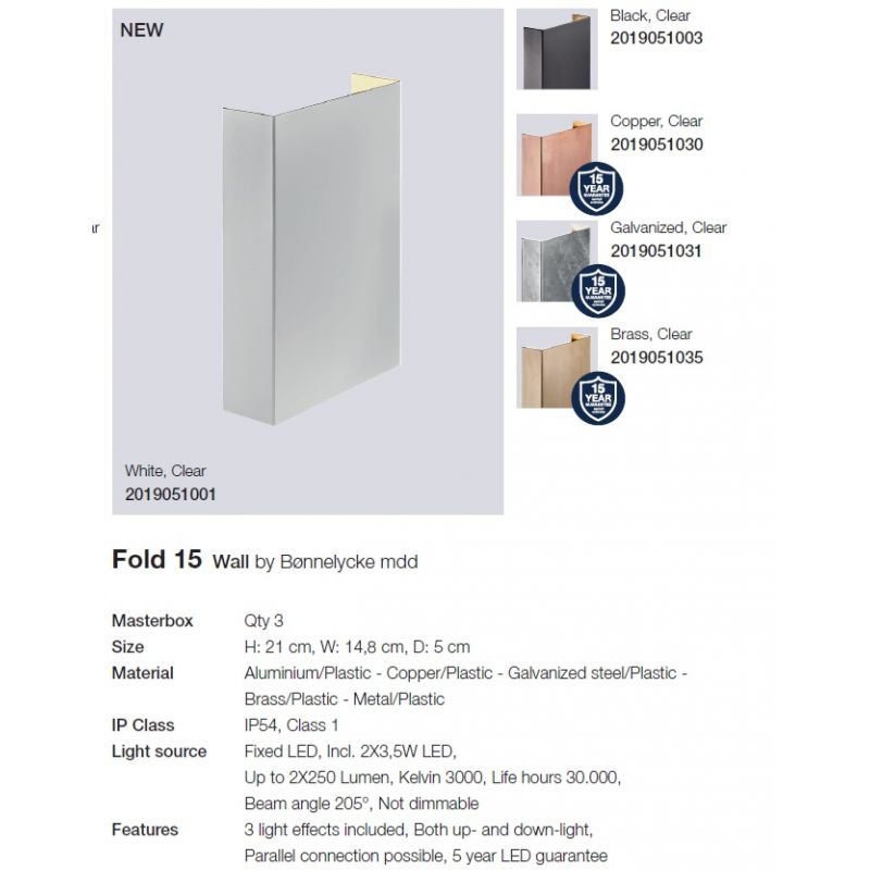 Fold creează o entitate completă și decorativă care se potrivește atât arhitecturii clasice, cât și minimaliste. Lumina strălucește atât în sus, cât și în jos, într-un efect grafic frumos, ceea ce face ca Fold să fie potrivită atât în interior cât și în exterior. Abajurul magnetic face instalarea ușoară și un aspect distinct fără suruburi vizibile.