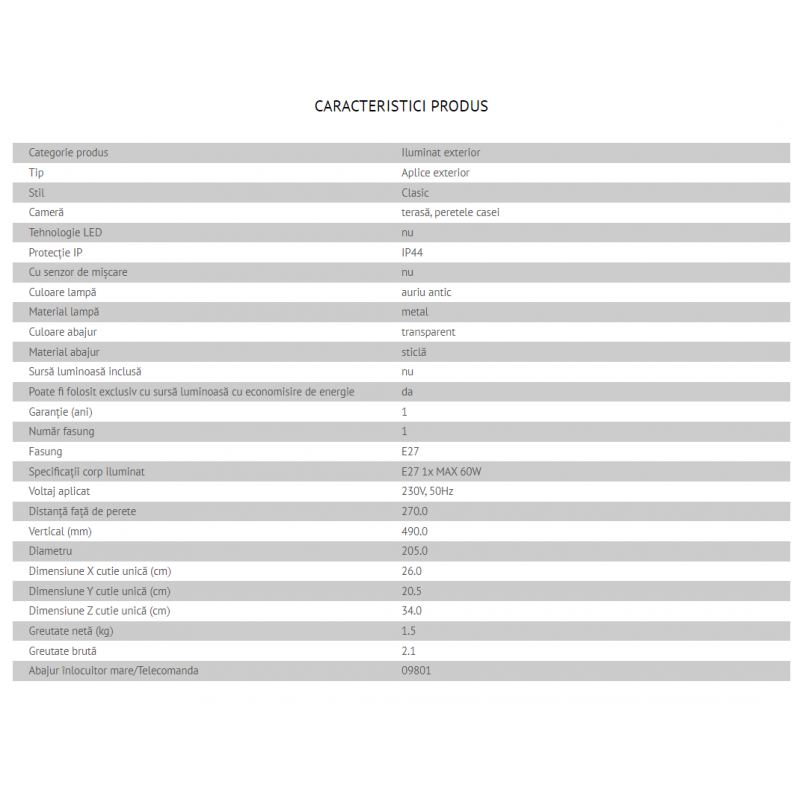 | Putere | 1x max E27 100 Watt exclus din pret |