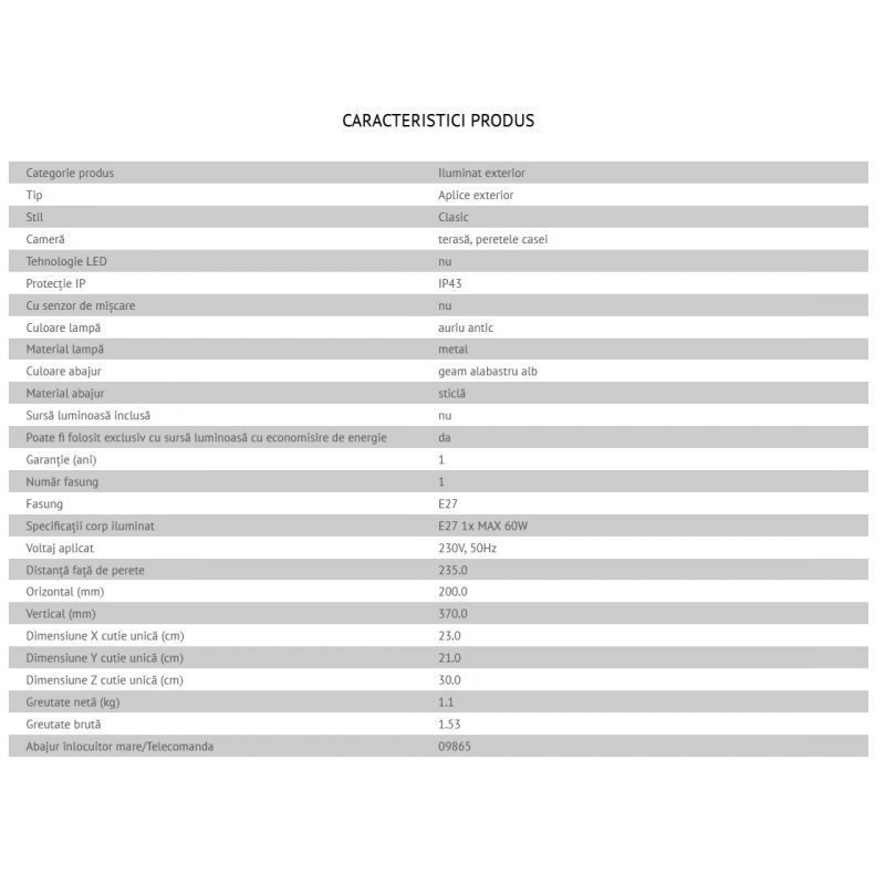 | Materiale | Metal finisaj auriu antic, sticla alabastru |