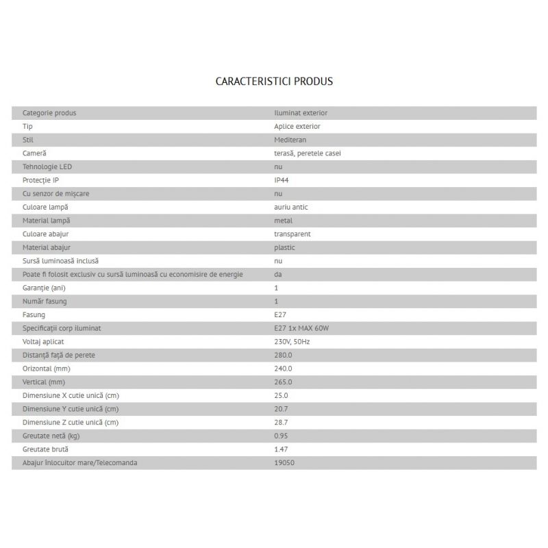 Aplica pentru iluminat exterior, lampa este potrivita pentru iluminatul zonelor de intrare casa, terasa și cele de trecere din aer liber.