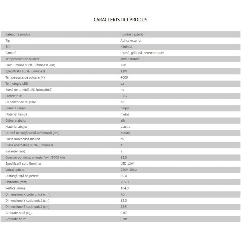 Aplica pentru iluminat exterior cu protectie IP65, lampa este potrivita pentru iluminatul zonelor de intrare casa, terasa și cele de trecere din aer liber.