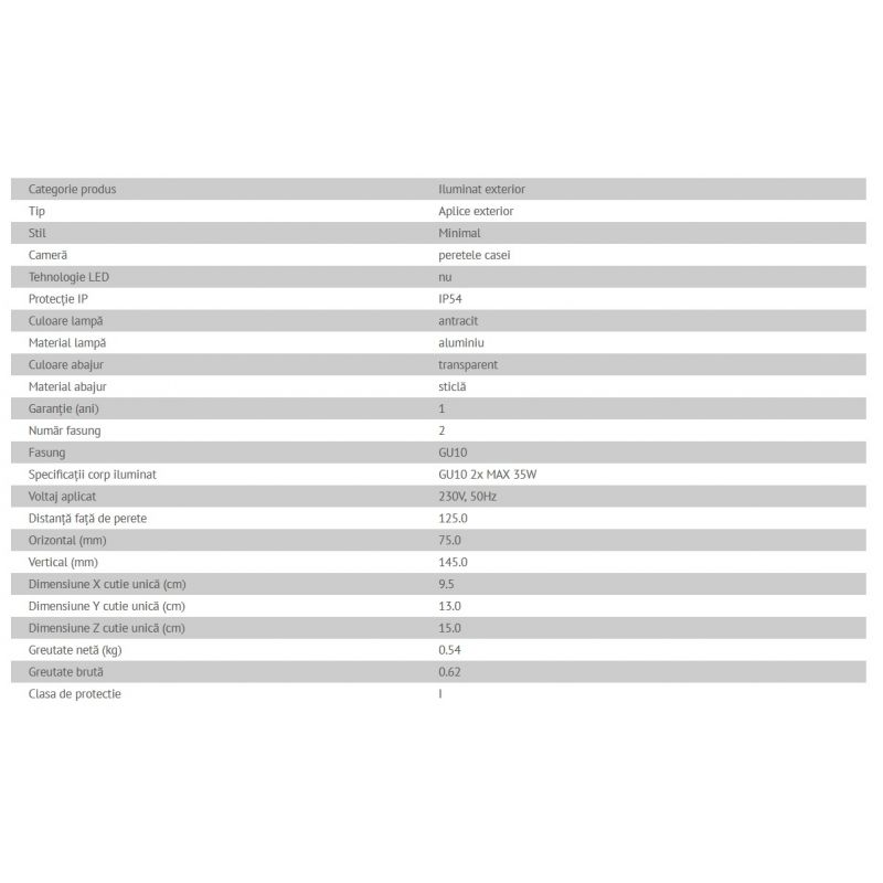Descriere | aluminu finisaj antracit, sticla transparenta |