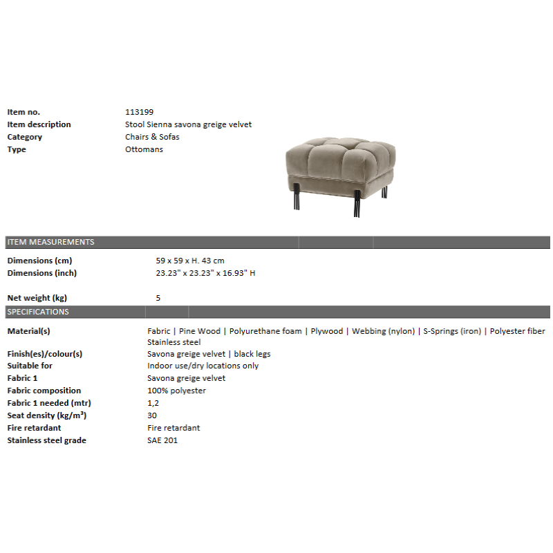 | Descriere | tapiterie din tesatura cu efect de catifea-100% poliester greige (o nuanta intre bej si gri), lemn de pin, umplutura spuma si fibre de poliester, placaj, arcuri, picioare din otel finisaj negru |