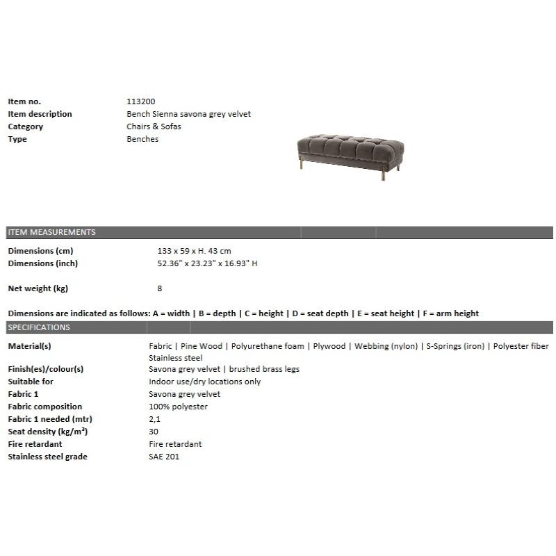 | Descriere | tapiterie din tesatura cu efect de catifea-100% poliester gri savona, lemn de pin, umplutura spuma si fibre de poliester, placaj, arcuri, picioare din otel finisaj alama |
