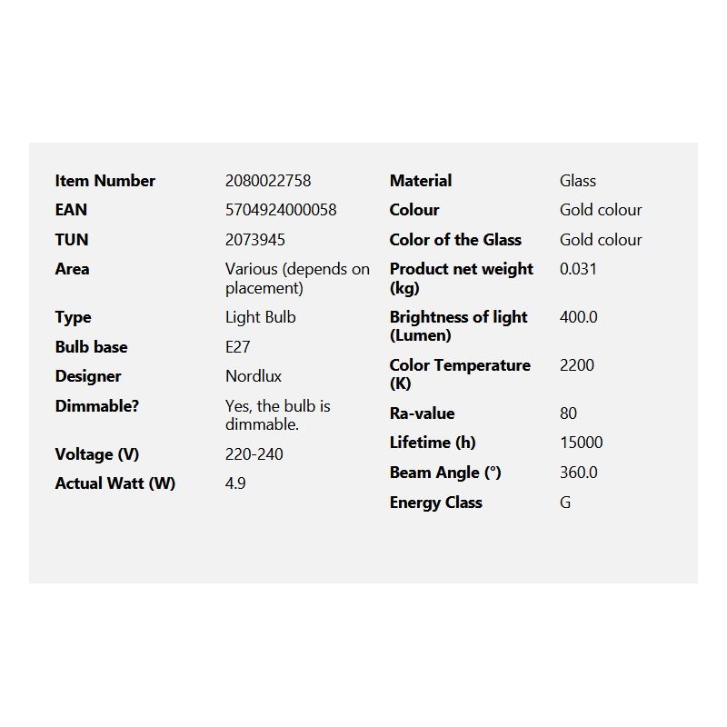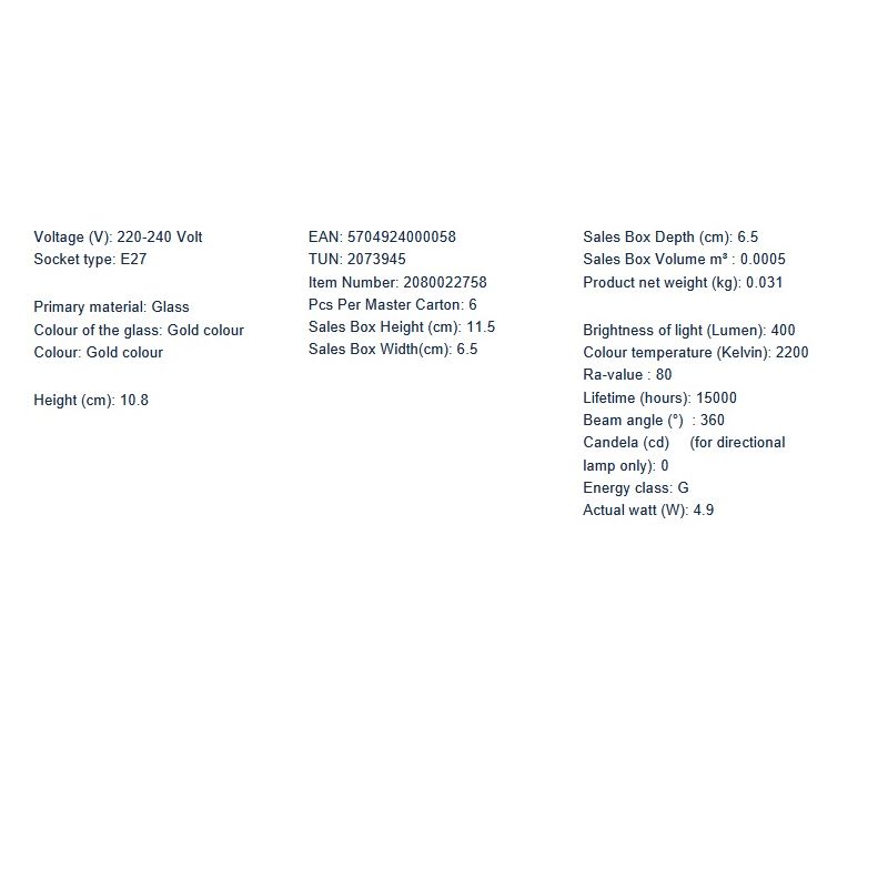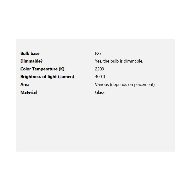 Putere | 4,9 Watt LED dimabil 400Lm, 2200K |