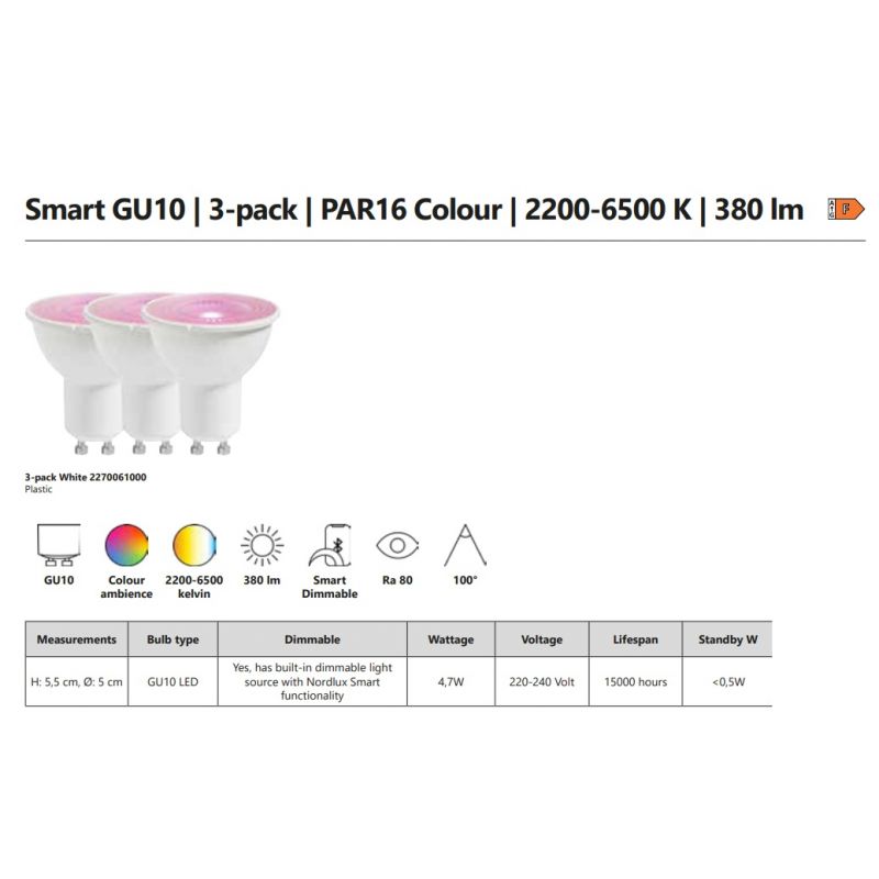 Putere | 4,7 Watt, LED RGB 380LM, 2200-6500K smart dimabil cu aplicatie telefon/ tableta sau telecomanda Nordlux Smart exclusa din pret |