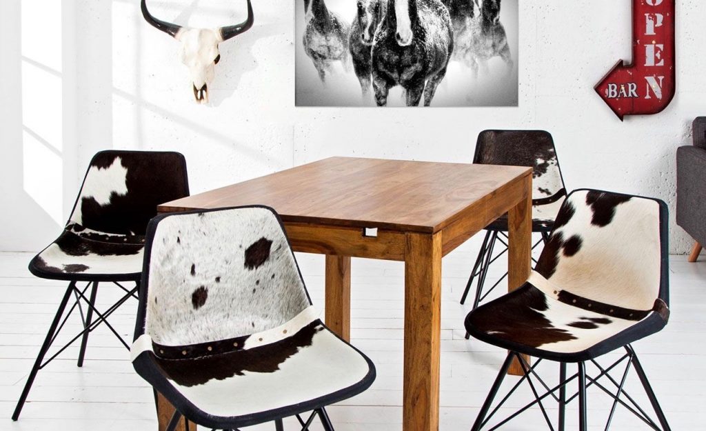 Ceea ce contribuie vizual cel mai bine la stilul „country modern” este tiparul de piele de animal pe care îl imediat, oricine, îl asociază cu o tematică rustică. Acesta nu trebuie să fie strident sau sufocant. Poate să apară pe un covor de piele sau pe tapițeria scaunelor Toro.