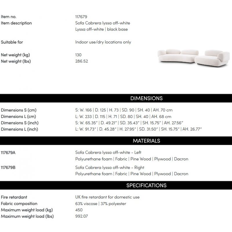 | Materiale | proiectata cu doua parti separate, tapiterie din tesatura lyssa off-white, placaj, spuma poliuretanica, baza din lemn negru |