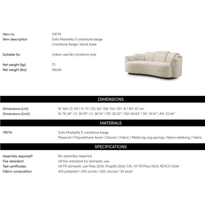 | Dimensiuni | latime:194cm; adancime:101cm; inaltime:73cm; inaltime sezut:41cm; greutate:72kg |