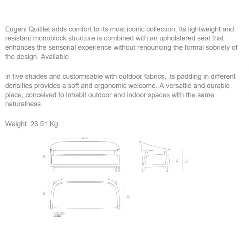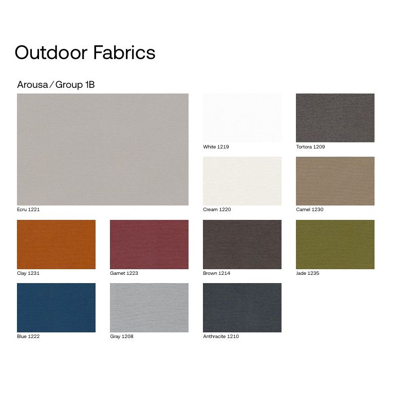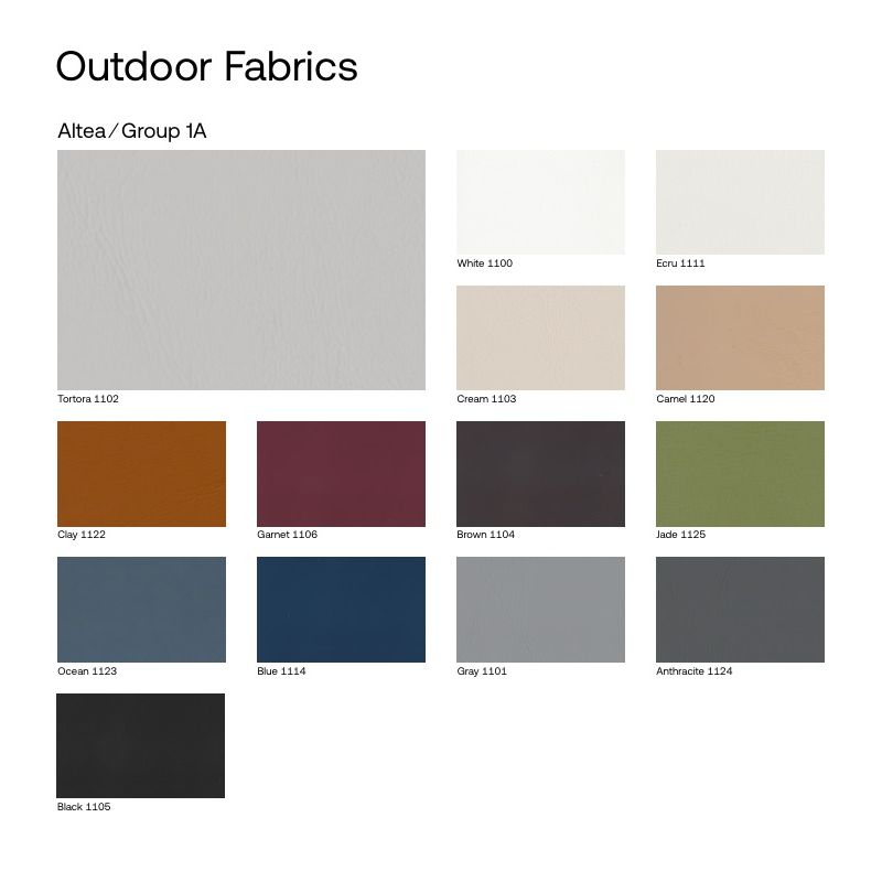 | Materiale | polietilena turnata, rezistent la intemperii si raze UV, varianta cu sezut tapitat tesatura din Group 1A,B inclusa in pret, pentru varianta si spatar tapitat sau tesaturi din alte grupe se aplica o diferenta pret (a se solicita oferta pret) |