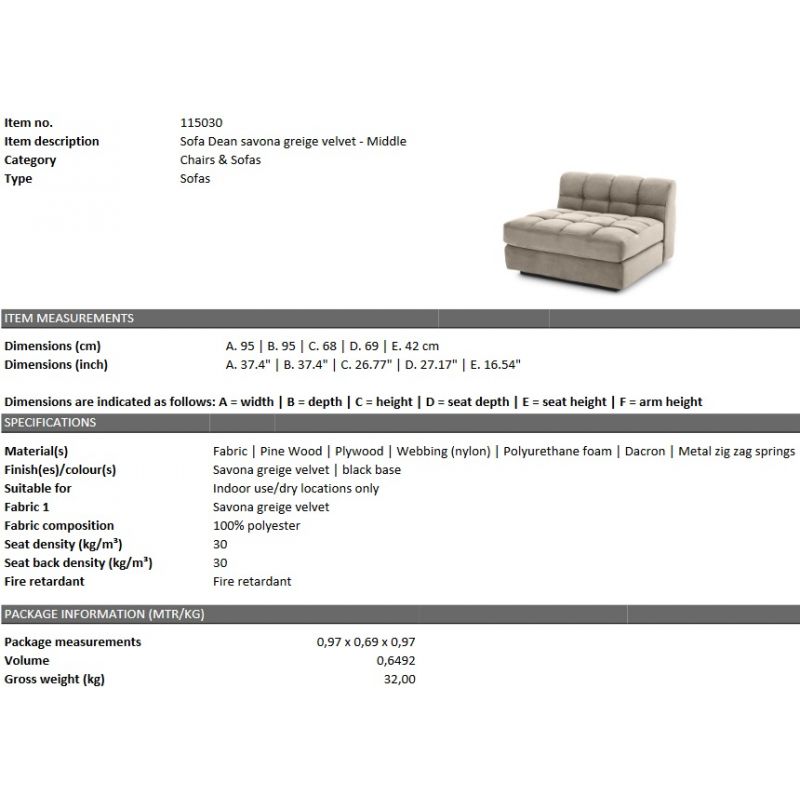 | Descriere | canapea realizata din lemn de pin, placaj, tesatura din catifea savona greige-100% poliester, umplutura spuma |