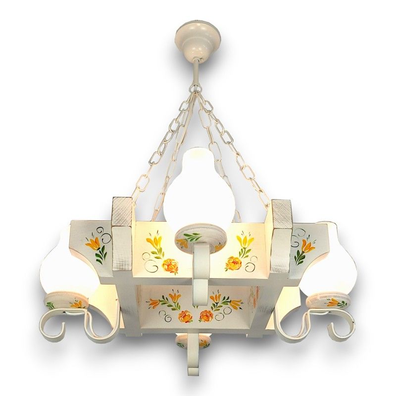 | Descriere | lemn de fag, motiv floral pictat, fier forjat patinat si abajururi mate tip opait |