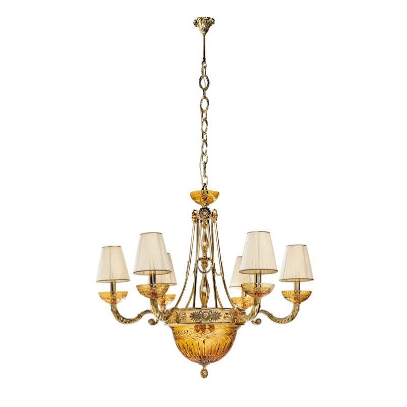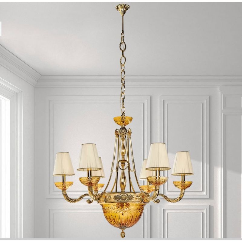 Materiale | realizat manual din alama turnata sub presiune, o arta straveche a mesterilor italieni, sticla chihlimbar, abajur crem organza plisata |