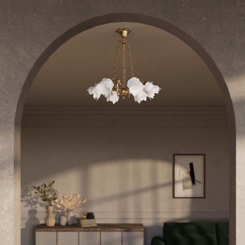 | Materiale | structura din alama disponibila in finisaj OBS ( Bronze Satin Brass) sau OAS (Antique Brass), heruvim fin sculptat care tine un abajur din sticla mata in forma de floare |