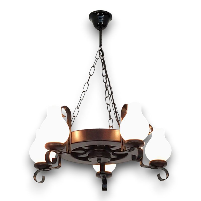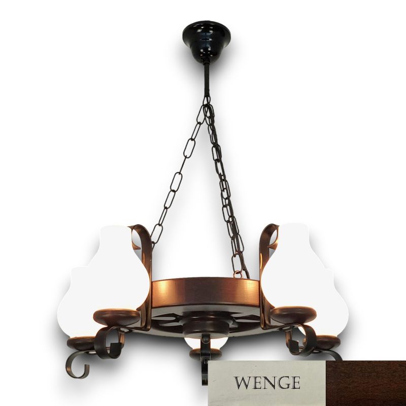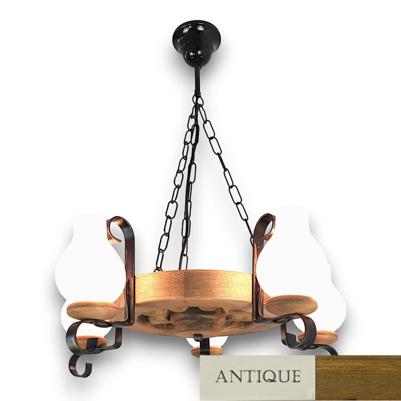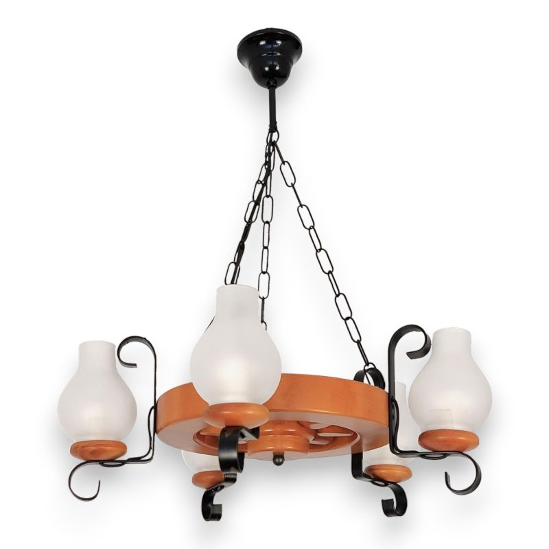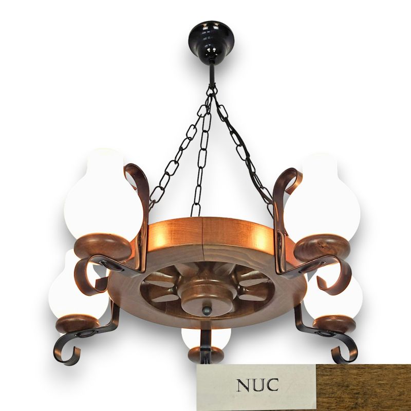 | Descriere | lemn de fag, fier forjat patinat si abajururi mate tip opait |