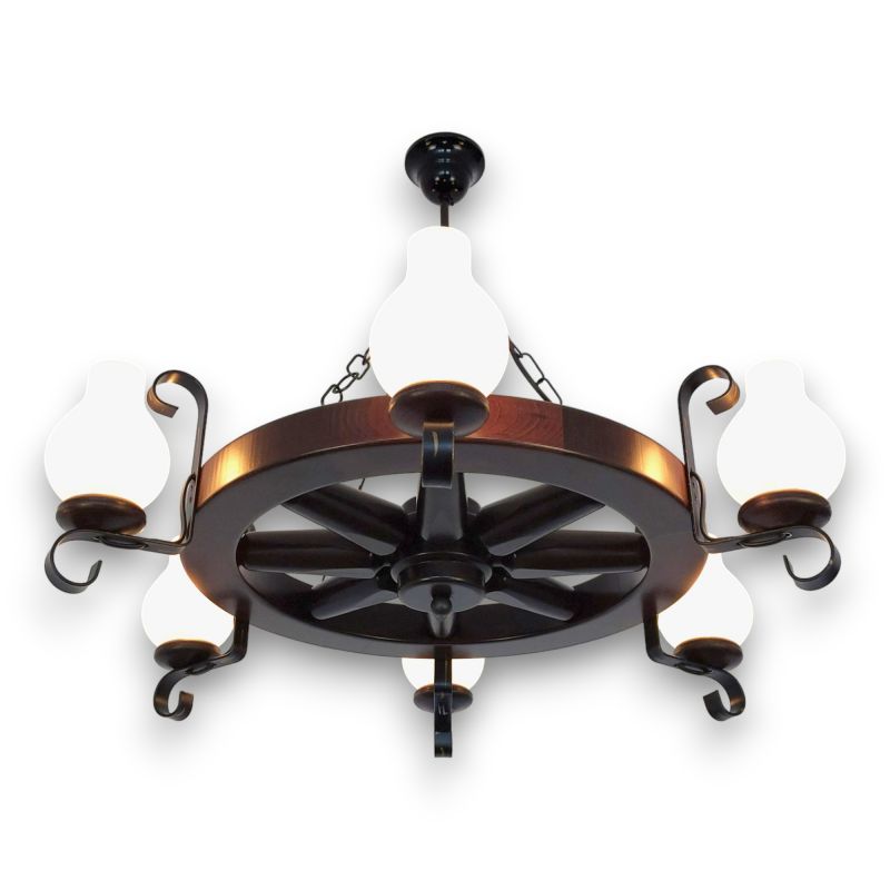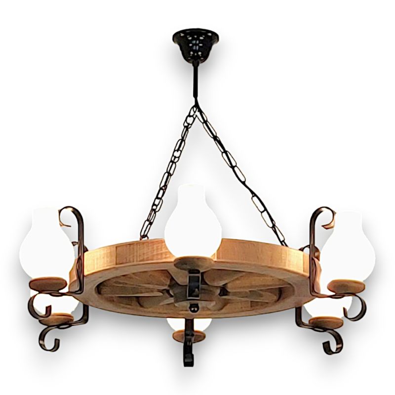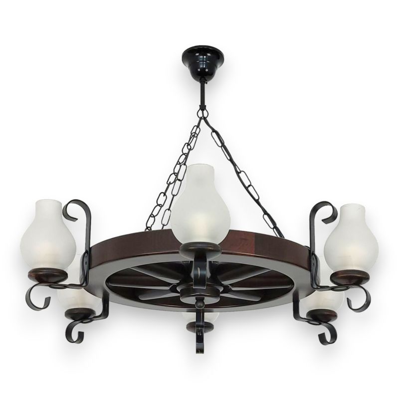 | Descriere | lemn de fag, fier forjat patinat si abajururi mate tip opait |