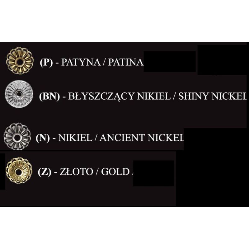 | Descriere | metal alama disponibil in 4 finisaje (patinat (P), nickel antic (N), nickel lucios (BN) sau auriu (Z)), cristal, abajur textil disponibil in diferite finisaje |