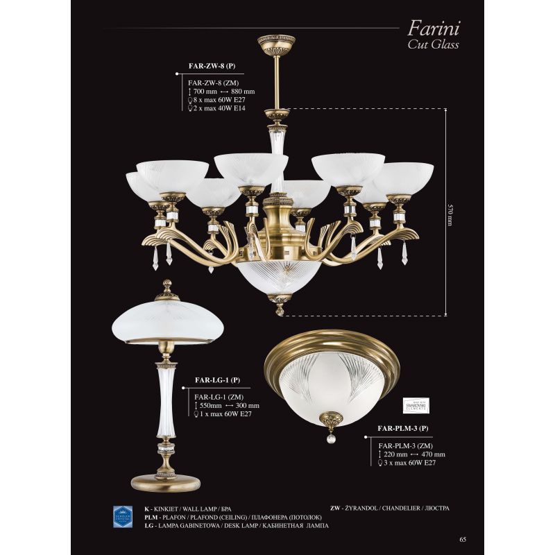 Corpurile de iluminat Farini, elegante și sofisticate se disting prin stilul elegant și sofisticat, farmec unic, șic și lux. Baza este realizată din alamă de înaltă calitate si sticlă magnifică. Datorită dimensiunii lor compacte, lustrele din colecție Farini pot fi folosite chiar și în camere mici. Orice interior va scânteia într-un mod complet nou cu lustrele Farini rafinate, grațioase și luxoase.