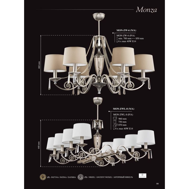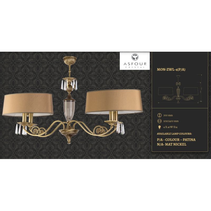 | Descriere | metal alama disponibil in 2 finisaje -alama patinata (P) sau alama finisaj nickel antic (N), cristal Asfour, abajur textil disponibil in diferite finisaje |