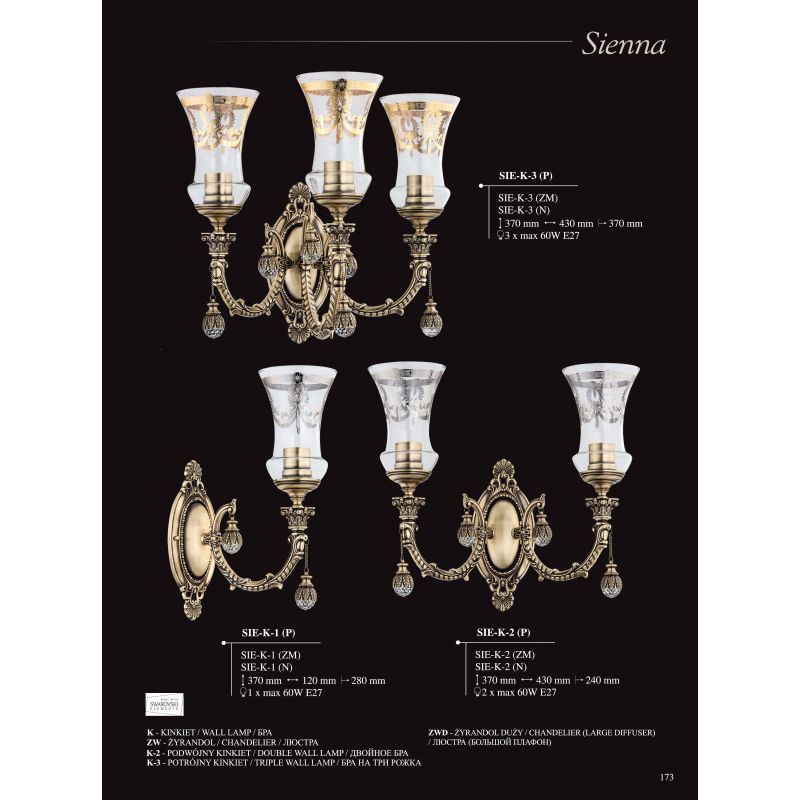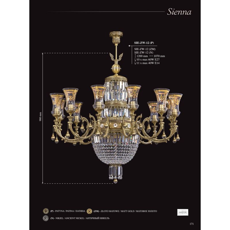 Luxul regal al lămpilor din colecția Sienna nu vor lăsa pe nimeni indiferent. Fiecare lustra este realizată manual, fiecare detaliu este gândit, cu dragoste și măiestrie. Bazele puternice și frumoase din alamă, nuanțele elegante de sticlă italiană, cu elemente decorative de lux spumante, realizate din cristale, vor deveni decorația regală a oricărui interior, fie că este vorba de un restaurant, hotel, casă de țară sau apartament. Alegerea unor astfel de lămpi accentuează gustul estetic al proprietarilor de case și, de regulă, vorbește despre respectabilitatea și prestigiul lor.