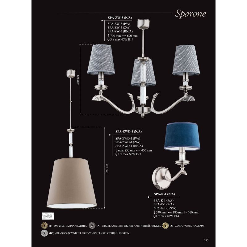 Colecția Sparone este reprezentată de corpuri de iluminat elegante și sofisticate, cu o bază rezistentă și elegantă, realizată din alamă de înaltă calitate, decorate cu elemente de decor rafinate, realizate din Cristal Scholer și abajururi elegante din țesături. O combinație armonioasă și magnifică de simplitate și eleganță a designului accentuează stilul și noblețea lămpilor Sparone, care vor crea cu siguranță o atmosferă de rafinament, frumusețe inedită și ușurință uimitoare în orice interior.