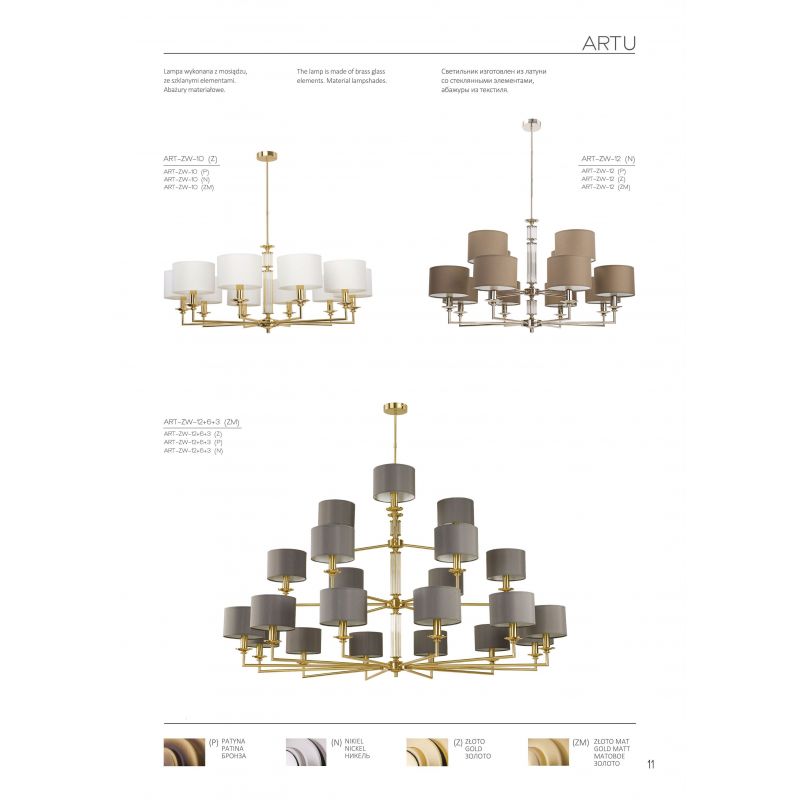 Colecția Artu modernă din aramă a cărei baze sofisticate sunt decorate cu abajururi și elemente decorative din sticlă. Și, deși scopul practic al oricărei lustre este iluminarea principală sau suplimentară a camerei, designul său holistic poate spori frumusețea și atractivitatea interiorului în care este instalată. Un frumos candelabru, aplica, lampă de podea și lampă de masă din alamă vor ocupa un loc demn în interiorul unei clădiri rezidențiale, hotel, restaurant sau birou, dar pentru a crea o iluminare eficientă, mai multe lămpi din aceeași colecție Artu ar trebui combinate.