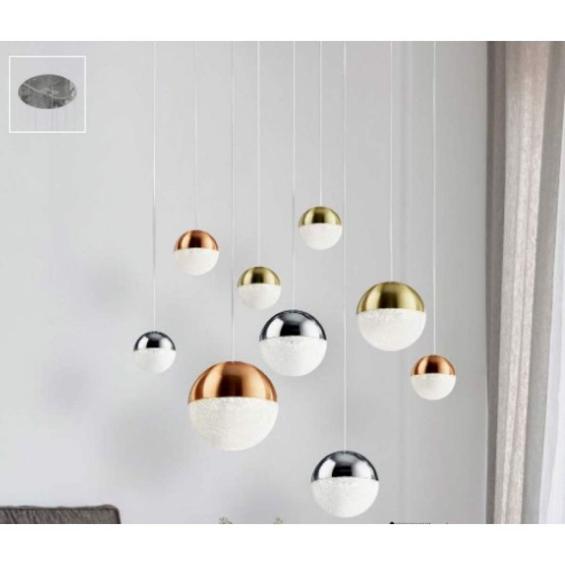 Lustra design modern cu nouă pendule LED de culoare crom, cupru și alama satinată cu înălțime reglabilă. O lumină ideală pentru o bucătărie, o sală de mese sau un bar. Puteti decora cu aceasta lustra camera de zi sau holul casei Dvs., dar este potrivit si pentru decorarea restaurantelor, magazinelor sau biroului Dvs.