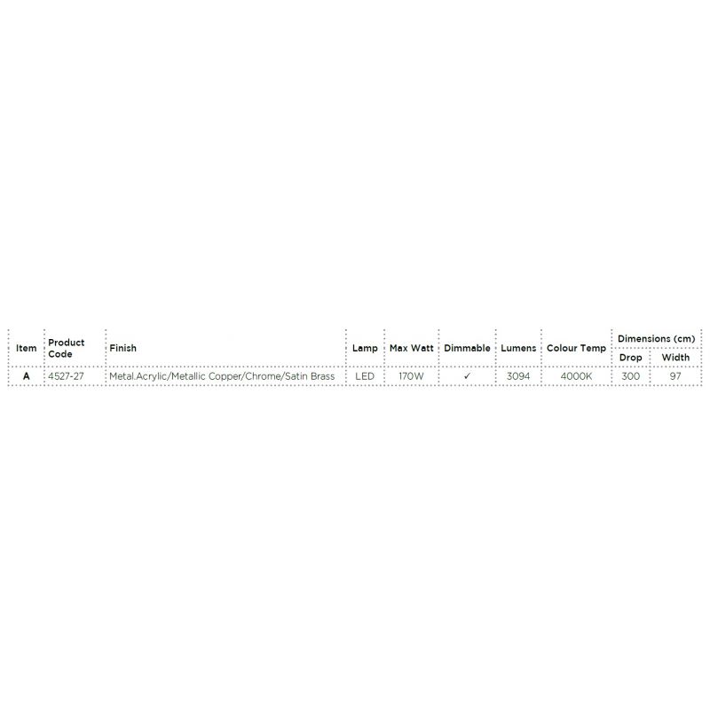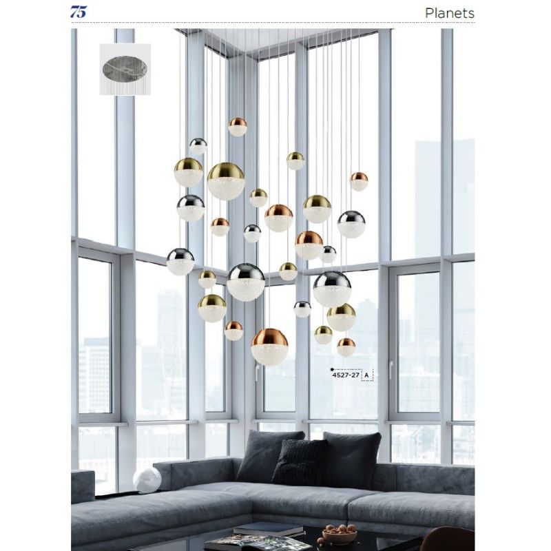 Lustra design modern cu 27 pendule LED de culoare crom, cupru și alama satinată cu înălțime reglabilă. O lumină ideală pentru o bucătărie, o sală de mese sau un bar. Puteti decora cu aceasta lustra camera de zi sau holul casei Dvs., dar este potrivit si pentru decorarea restaurantelor, magazinelor sau biroului Dvs.