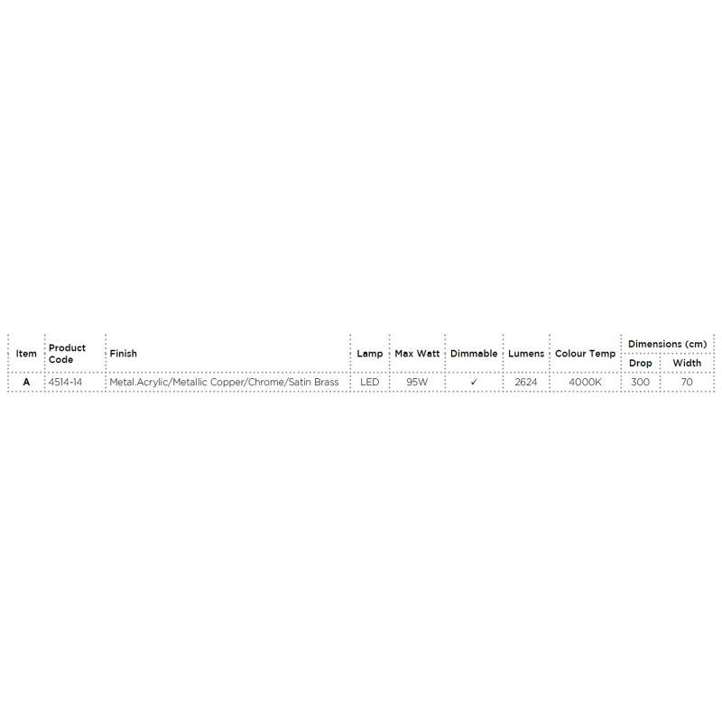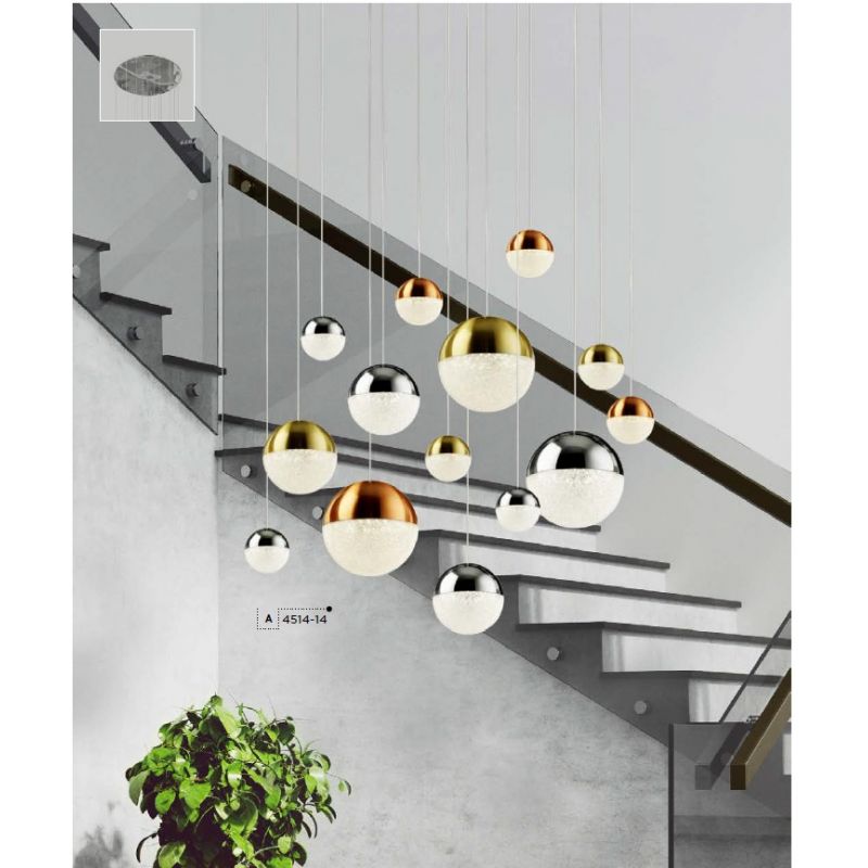 Lustra design modern cu 14 pendule LED de culoare crom, cupru și alama satinată cu înălțime reglabilă. O lumină ideală pentru o bucătărie, o sală de mese sau un bar. Puteti decora cu aceasta lustra camera de zi sau holul casei Dvs., dar este potrivit si pentru decorarea restaurantelor, magazinelor sau biroului Dvs.
