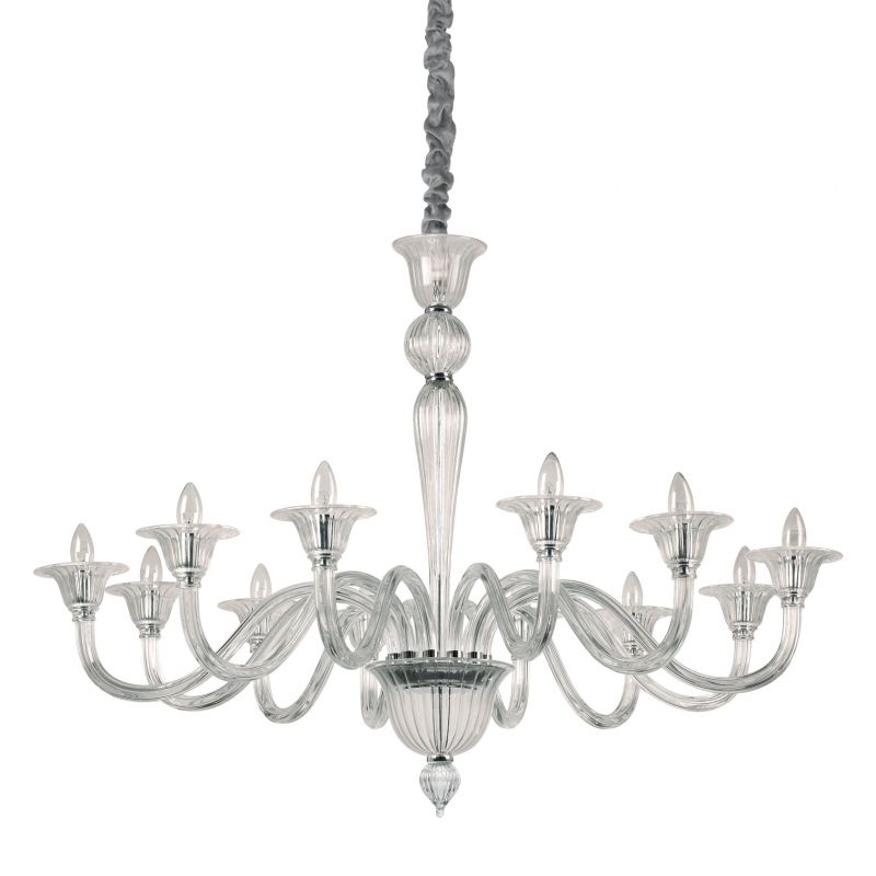 Candelabru elegant cu 12 brate BRIGITTA din sticlă suflată transparentă sau chihlimbar, realizat manual cu cadru metalic și lanț acoperit de catifea. corp de iluminat ce asigura lumina de accent, fiind o solutie decorativa pentru iluminatul interior din living, dormitor, dining...