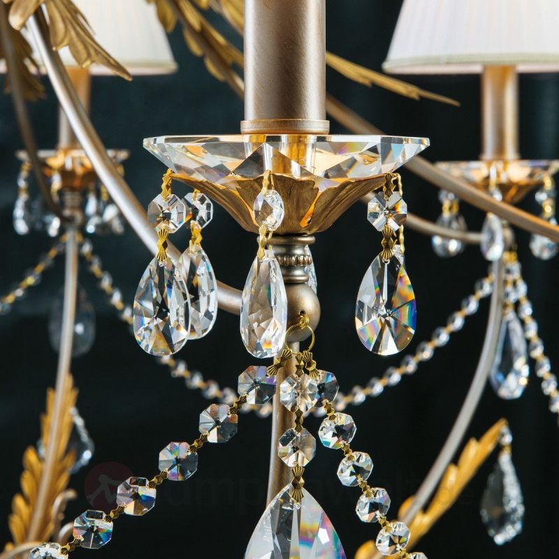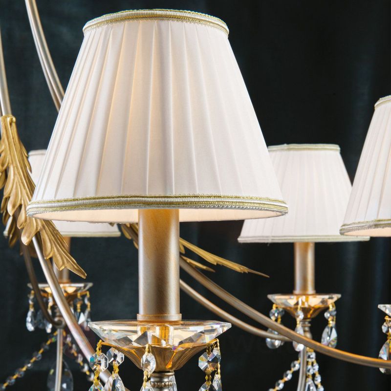 | Materiale | metal finisaj argintiu pictat manual cu nuante aurii, decorat cu frunze metalice, crystal plumb nobil, abajur din tesatura organza alb sau champaqne |